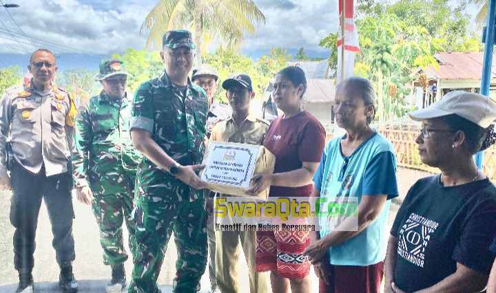 SWARAQTA- Komandan Kodim (Dandim) 1307/Poso, Letkol Arm. Edy Yulian Budiargo, S.Sos., M.Han., memberikan bantuan sembako kepada warga terdampak bencana gempa bumi berkekuatan 6,0 SR di Desa Masani, Kecamatan Poso Pesisir, Kabupaten Poso, Sulteng, Senin (18/8/2025).